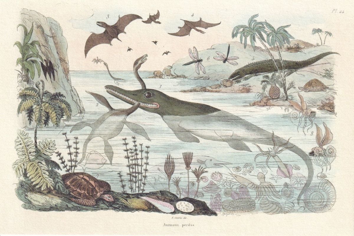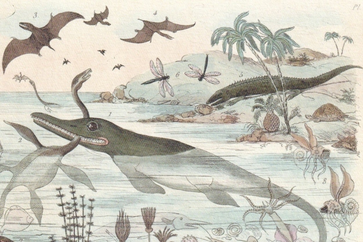 イクチオサウルス、プレシオサウルス、プテロダクティルス、アンモナイトなど描かれてます。