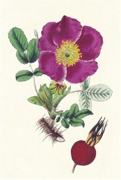 英国で出版された植物誌より、ハマナスの図、トゲの多い茎からHedgehog roseとも呼ばれる。