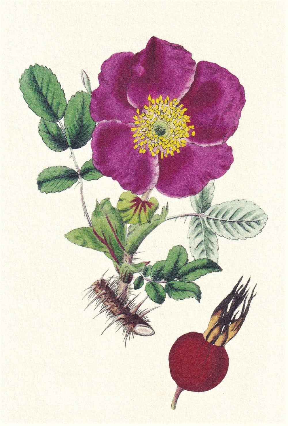 英国で出版された植物誌より、ハマナスの図、トゲの多い茎からHedgehog roseとも呼ばれる。で、植物をテーマとしたセット販売品です。