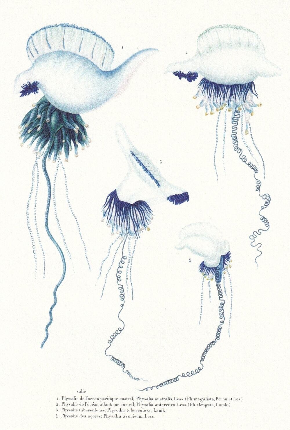 フランスによるコキーユ号世界一周探検航海図譜より、カツオノエボシの図。青く透明な体を点描銅版画で描いている。