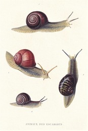 フランスの博物学者フェルサックによる有肺類の図譜より、様々なエスカルゴの図。